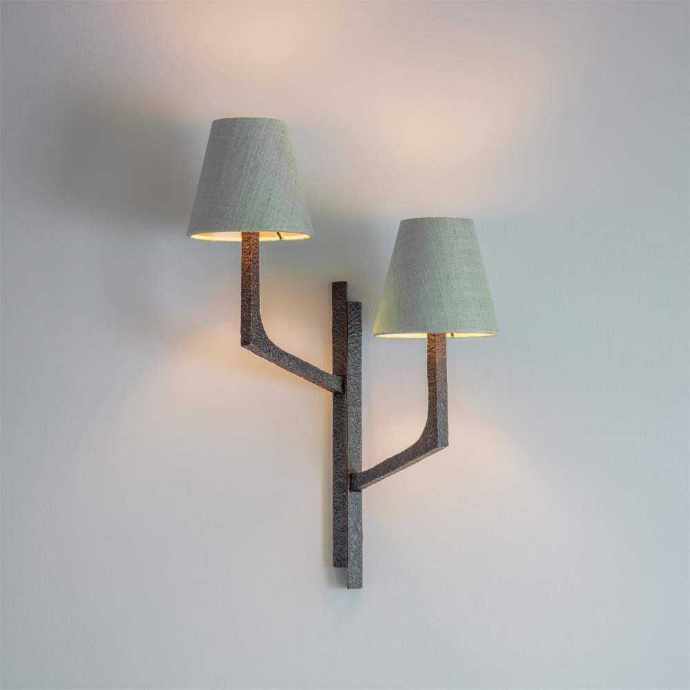 Pedicel Wall Light with Dove Grey Silk-Linen Shade – Lit – Square – Low Res