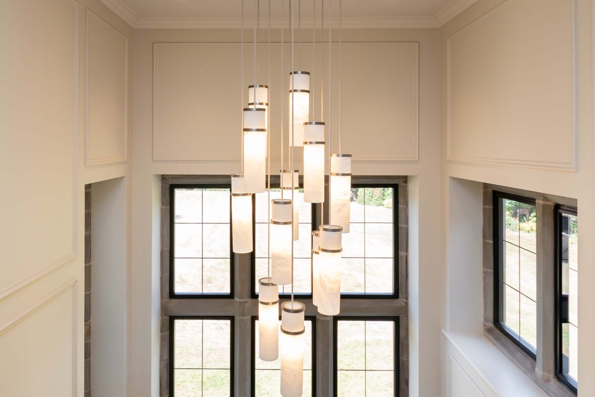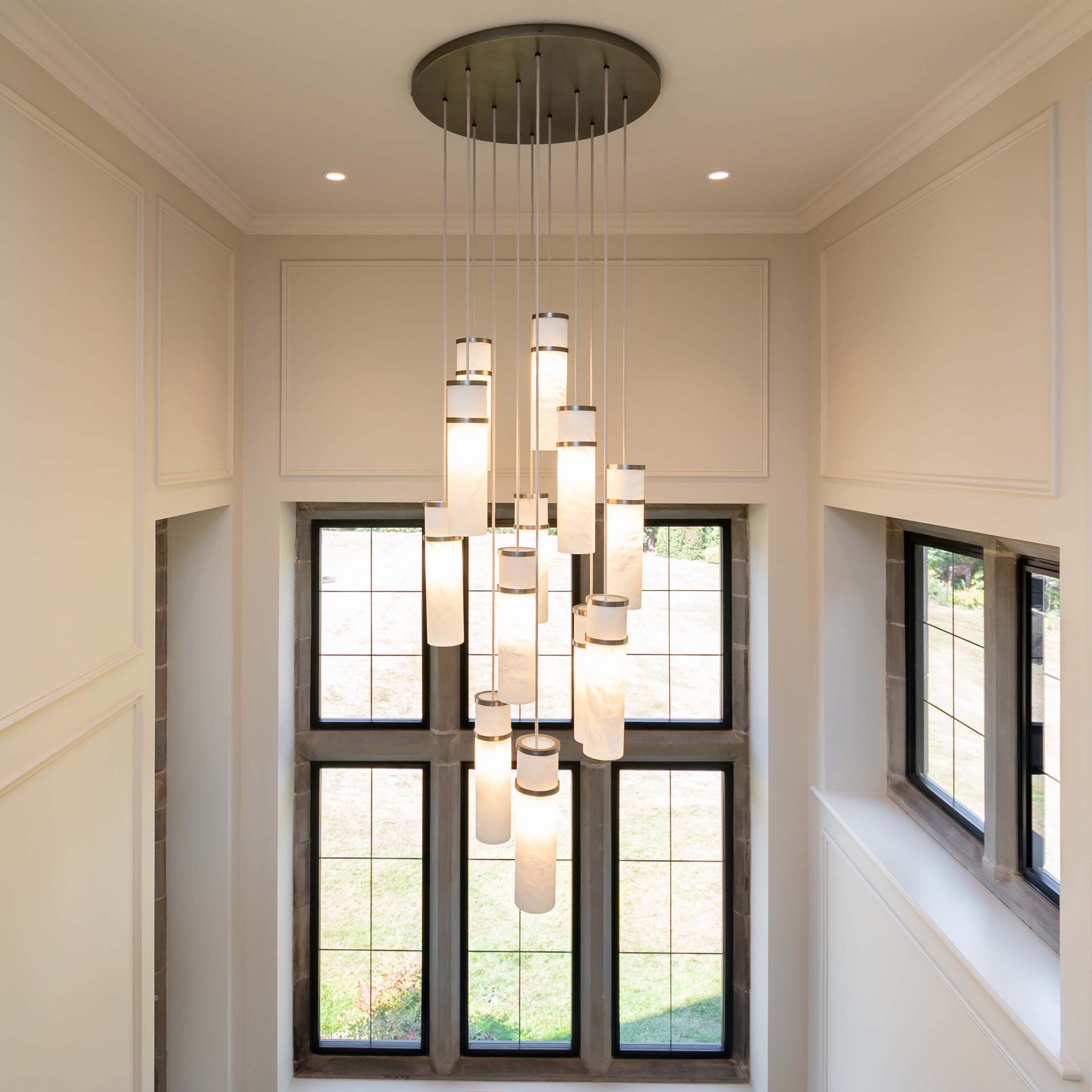A bespoke version of our Alabaster Pendant Cluster with more streamlined decorative details on the shade, this solution with the Antique Brass band details on each shade works so well with the architectural detail in the space!